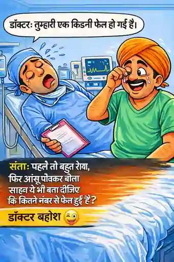 डॉक्टर के क्लीनिक पर होने वाली मजेदार बातचीत, मरीजों के अतरंगी सवाल और डॉक्टर साहब के सिर घुमा देने वाले जवाब—यही सब मिलकर इस कैटेगरी को बेहद खास बनाते हैं। अगर आप अपना मूड लाइट करना चाहते हैं या किसी बीमार दोस्त को हँसाना चाहते हैं, तो हमारा यह हिंदी चुटकुलों (Hindi Chutkule) का संग्रह आपके लिए ही है। यहाँ हमने संकलित किए हैं कुछ ऐसे बेहतरीन जोक्स जो आपको हँसा-हँसा कर लोट-पोट कर देंगे।